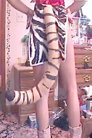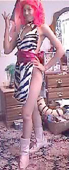 Black & White tiger striped minidress, with slits in sides, and low neckline.