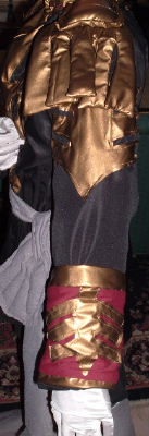 maroon collar and wrist cuffs, also with gold designs and edging