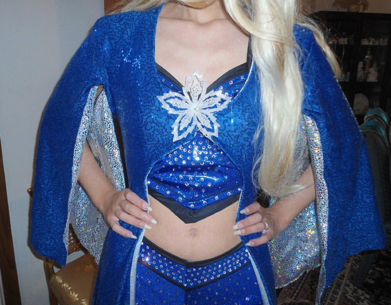 Royal blue sequin metallic long robe/jacket with open flared sleeves, fully lined in metallic holographic platinum/silver; the sleeves are lined in mosaic silver/platinum metallic holographic with silver gimp and sequin trim; on back it says the name 'Flair' in faux crystal gems